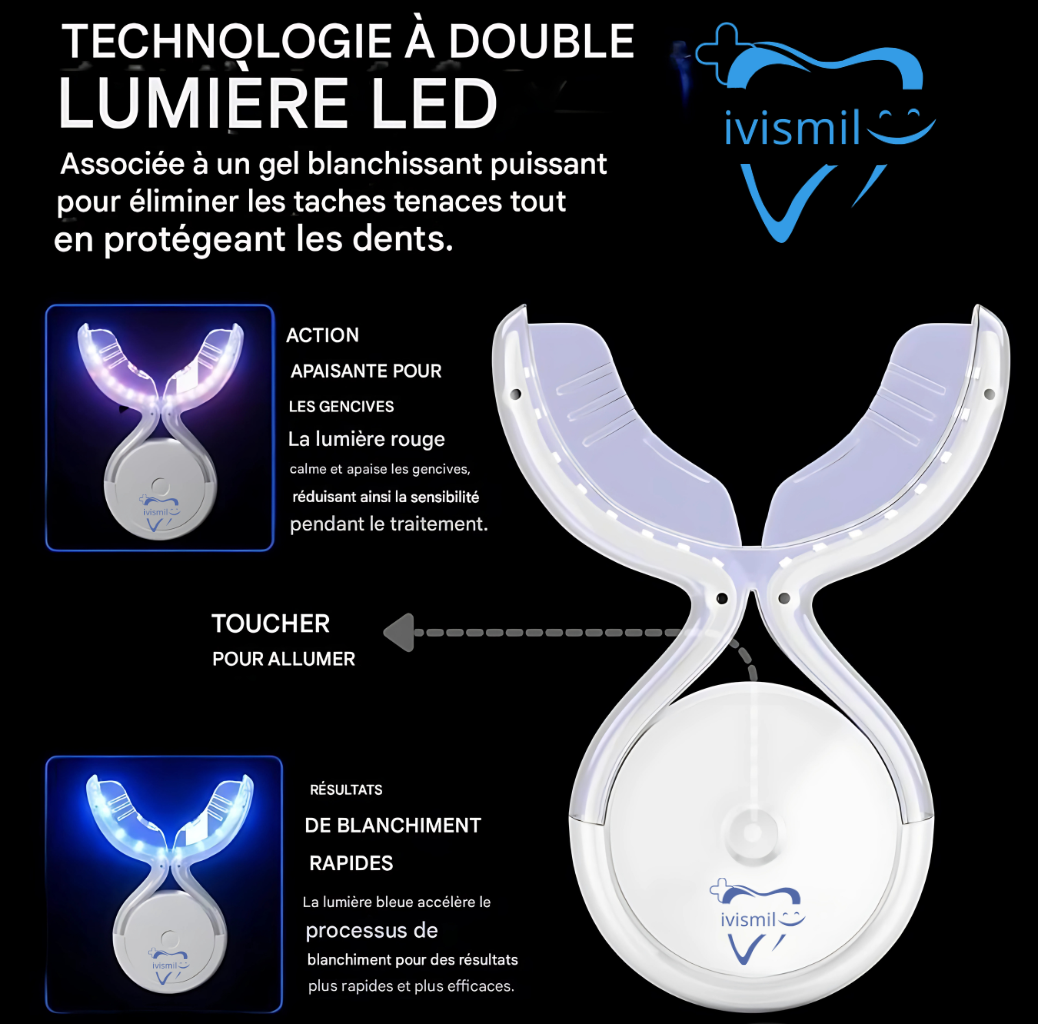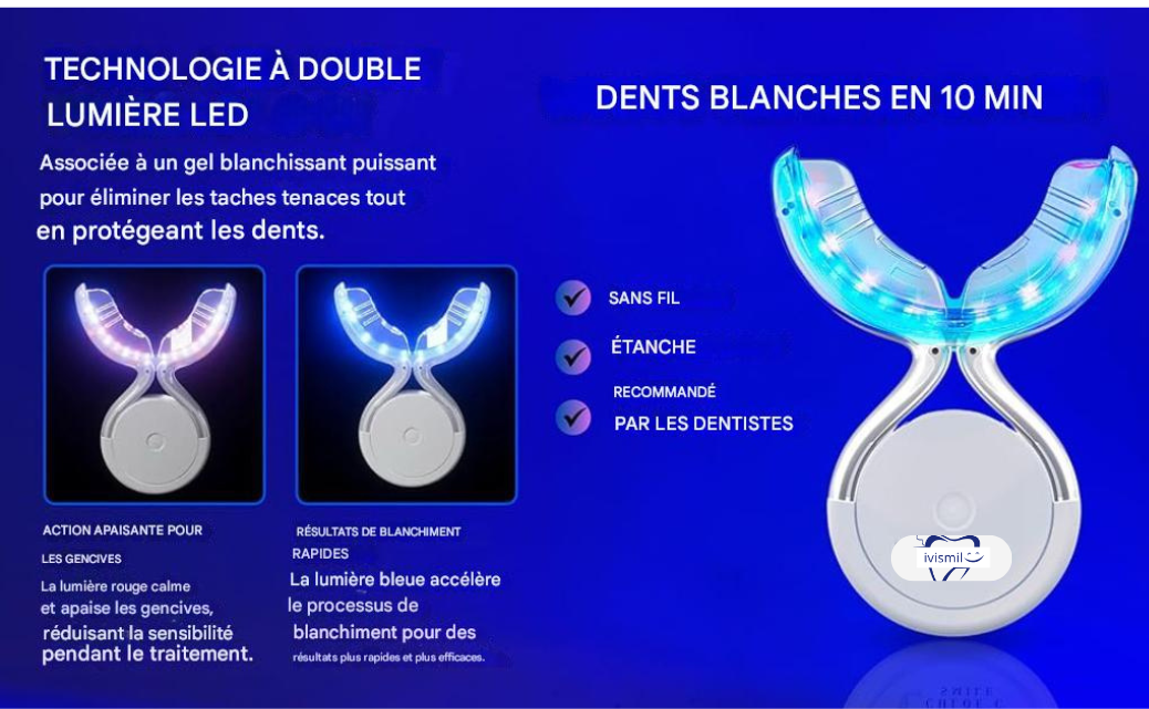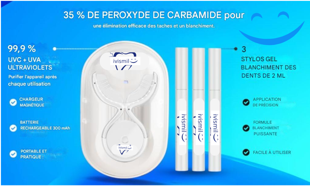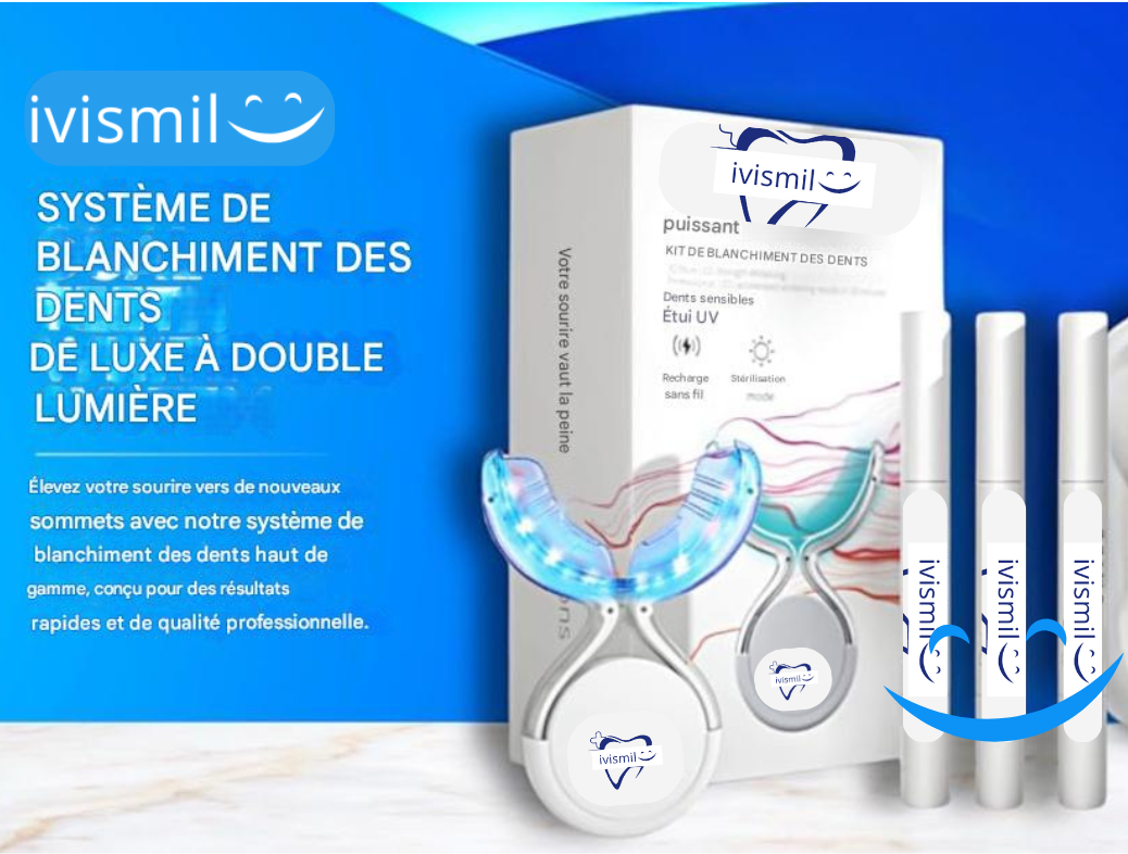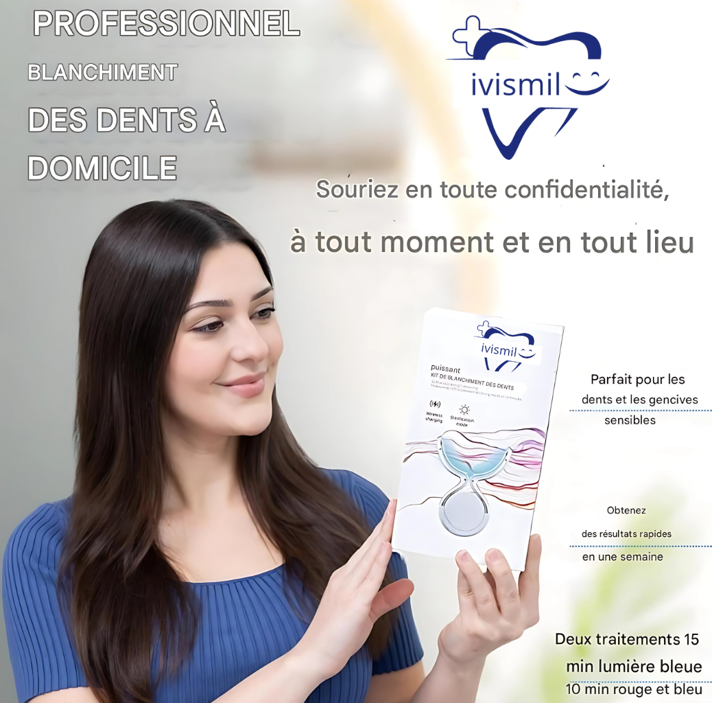 "Souriez en toute confiance n’importe quand, n’importe où avec ivismil Notre kit de blanchiment des dents professionnel combine une technologie LED avancée avec une formule douce pour blanchir vos dents en toute sécurité et efficacement. Votre sourire mérite ce qu’il y a de mieux !