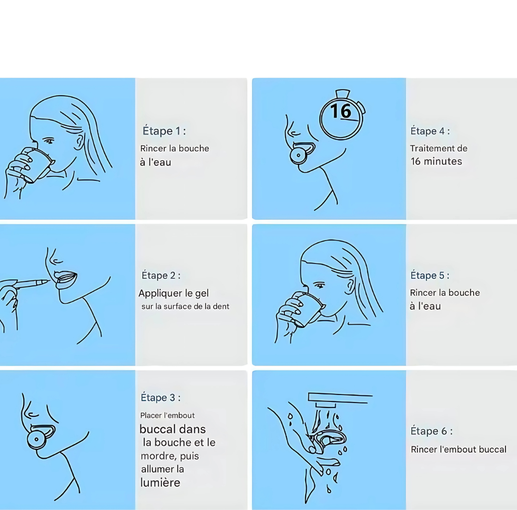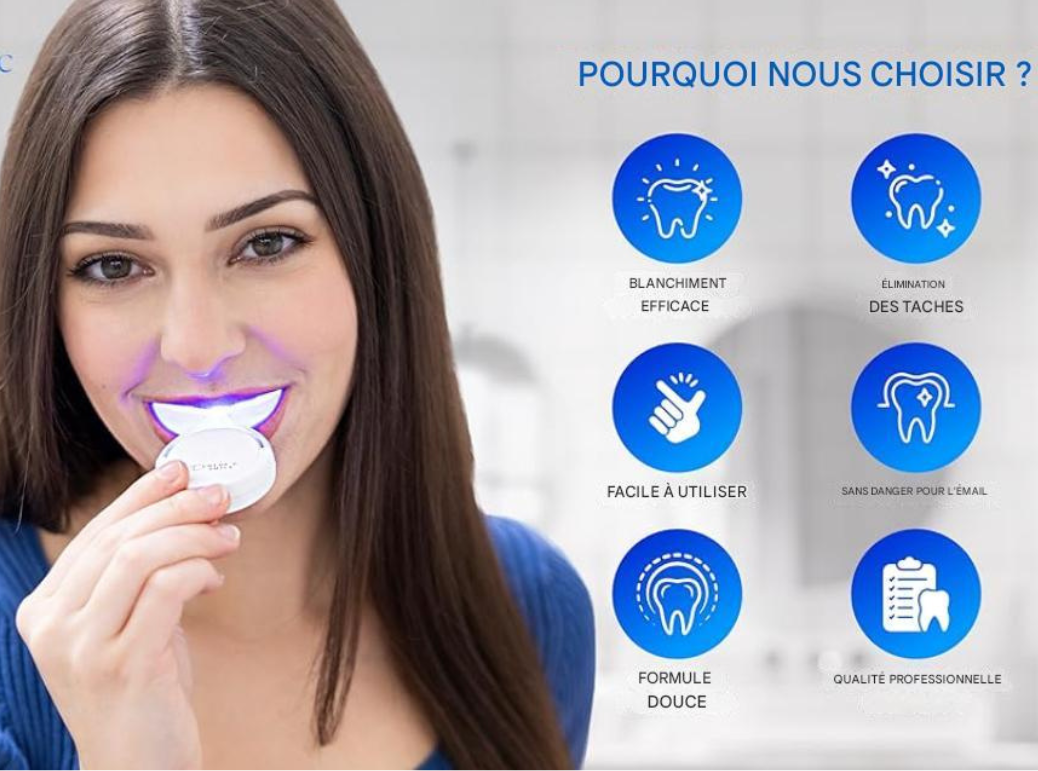 Lumière bleue : Accélère le processus de blanchiment en seulement 10 minutes.